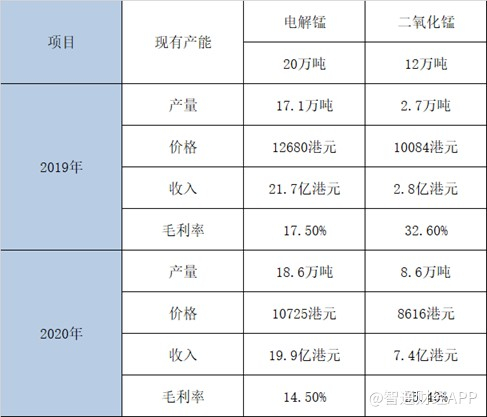 目前,南方锰业拥有电解金属锰产能20万吨。电解金属锰的下游主要应用于钢铁行业。2020年该业务的销售均价为10725港币,折合人民币约为8923元,毛利率14.5%。