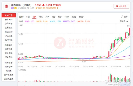在电解锰价格强势上涨下,南方锰业(01091)股价也大幅上涨,7月初至今股价累计涨幅超2.5倍。