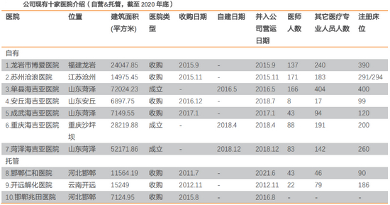 截至2020年底,海吉亚医疗集团旗下自有医院共7家,托管医院共3家;而在2021年海吉亚医疗还收购了贺州广济医院以及苏州永鼎医院。