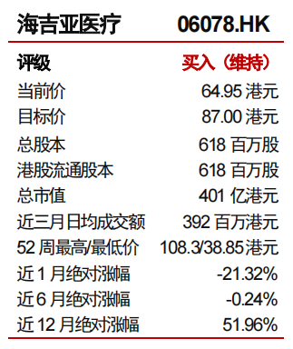 考虑到海吉亚医疗在肿瘤专科医疗服务领域的竞争壁垒、外延拓展性和长期增长潜力,参考可比公司估值,给予公司2021年105倍市盈率,对应目标价87港元,较现价约有50%上涨空间。