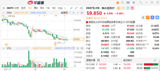 但是随着市场行情调整以及医疗医药集采等利空消息影响,海吉亚医疗也从110港元下跌至目前约60港元,下跌幅度约5成,市值蒸发超过300亿港元。