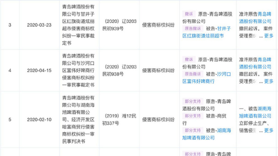 此外,青岛啤酒还因被侵害商标权与多家商行产生纠纷。