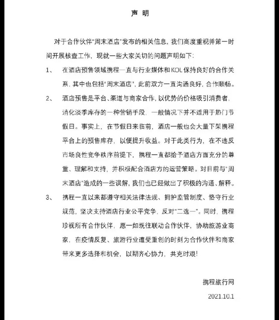 在申明中,周末酒店表示,今年3月到此次国庆节,相关酒店要求其下架产品的理由均被告知是应携程的要求,周末酒店掌握大量事实和证据。