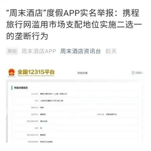 10月1日,国庆长假第一天,周末酒店举报携程实施“二选一”消息,登上了热搜。9月30日晚,周末酒店在全国12351平台举报携程“二选一”。
