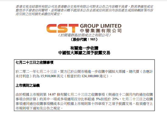 2021年7月19日,广发银行提出冻结恒大资金的消息传出之后,恒大债券暴跌。当晚,中誉集团突发公告称,其通过证券经纪商于公开市场收购总额为1100万美元2024年到期的10.5%中国恒大优先票据。7月23日,中誉集团再发公告称,“公司的间接全资附属公司立天科技有限公司已于公开市场进一步收购中国恒大票据”,总代价(含应计未付利息)约为1591万美元(相当于约1.241亿港元)。