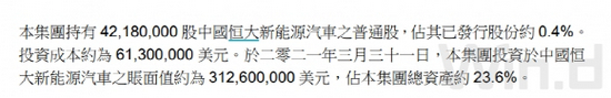 截至2021年3月31日,中誉集团持有恒大票据市值合共约为1.72亿美元,占总资产约12.9%。