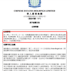 10月22日,华人置业再度发布公告,10月21日,公司通过场市场进行一连串交易出售本金额为5200万美元的已出售票据,总代价为1542万美元(不计息),计息总额为1.36亿港元,录得已变现净亏损为2.78亿港元,票据发行人为佳兆业。