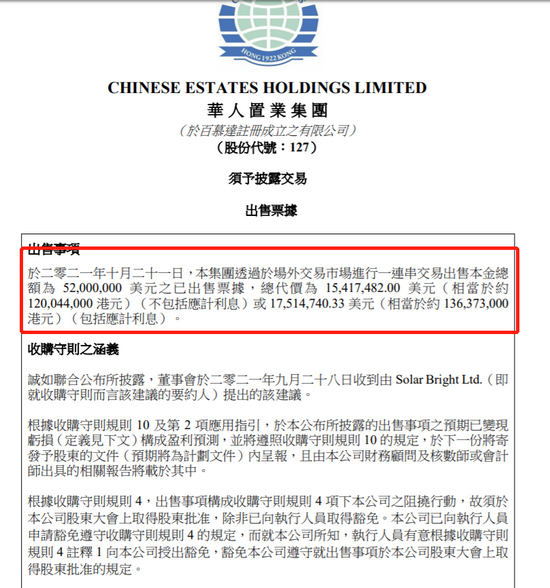 值得注意的是,10月21日华人置业发布公告,2021年10月19日至10月20日期间(包括首尾两日),集团透过于场外交易市场进行一连串交易出售本金总额为4800万美元的已出售票据,总代价为1830.7万美元(相当于约1.43亿港元)(不包括应计利息)或2037.7万美元(相当于约1.59亿港元)(包括应计利息)。