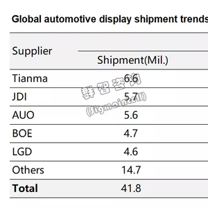 LG显示在追求高盈利的策略驱使下,逐渐减少其小尺寸和a-Si等低端产品出货比重,三季度车载显示面板出货量约为460万片,同比增长约9.5%,其大尺寸及LTPS产品出货量占比稳定提升。