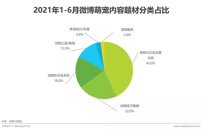 从题材来看,记录宠物日常生活的内容创作门槛较低,是各大平台上创作量最多的题材,宠物相关的热点资讯通常具有较强的话题性,成为关注宠物内容用户高频互动的活跃阵地。宠物内容一般只展现宠物形象,即使是剧情段子也较为简单易懂,比起故事性较强的内容,用户观看体验更轻松,满足了消磨闲暇时间的需求。2021年上半年微博萌宠内容中占比最高的是宠物日记及创意类内容,达到43%。另外,伴随养宠人群的扩大,宠物相关的公益救助、知识科普、宠物服务类内容也受到越来越多用户的关注,在微博萌宠内容中占比合计达到20%。