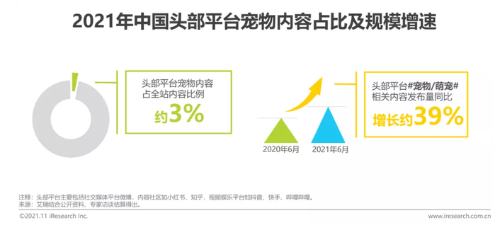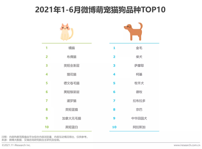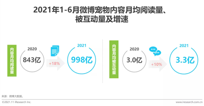 社交媒体、内容社区及视频娱乐平台是当前宠物内容聚集的主要平台,根据艾瑞核算,整体来看,2021年6月头部内容平台宠物相关内容发布量接近亿级,对比去年同期,头部平台宠物内容规模增速达到约39%,其中微博平台的宠物内容增速TGI达到109,高于行业平均水平。根据微博大数据,2021年1-6月微博宠物内容月均阅读量接近千亿,与去年同期相比增长18%,内容月均被互动量达到3.3亿,同比增速为10%。