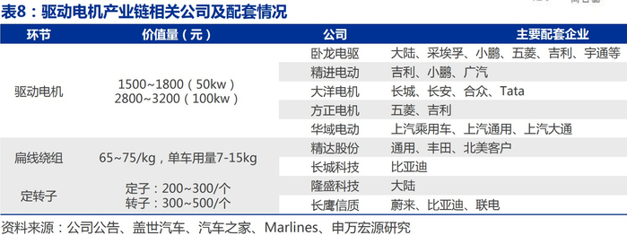 电机总成的玩家包括卧龙电驱、方正电机、双林股份等;绕组玩家包括精达股份、长城科技等;定转子玩家包括长鹰信质,隆盛科技。