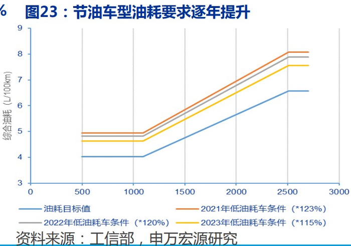 中长期,《双积分》政策对低油耗(HEV)车型的核算优惠,进一步体现出政府对该技术的大力扶持。在核算企业新能源汽车积分达标值时低油耗车型给予核算优惠。最新的管理办法将核算倍数从三年固定数值方式调整为逐年减少:2021-2023年分别为0.5/0.3/0.2倍,逐步向零油耗车靠拢。这意味着企业即使每年生产同样数量的HEV车型,其对应的每年需要合规的新能源正积分也在逐步减少,合规成本上HEV车型具备了一定的政策优惠。