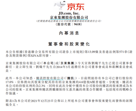 每持有21股腾讯股票派发1股京东A类股