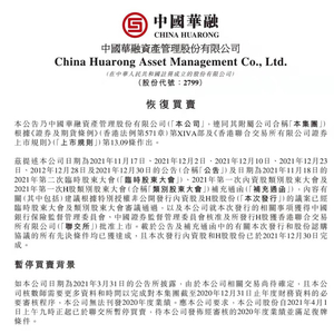 1月4日晚间,中国华融发布公告称,公司已向香港联交所申请自2022年1月5日上午9时正起于联交所恢复股份买卖。