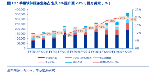 作为业务模式趋同的科技公司,小米和苹果均是以硬件为载体、以互联网变现作为核心的发展方向。苹果系列产品因其芯片、系统等独特护城河,相比小米有着较高的硬件毛利率,这一点恐难以追赶。但苹果公司的软件及服务收入由2012财年的120亿美元陡增至2021财年的684亿美元,年复合增长率高达21.35%,远高于硬件9.89%的增长率。2020财年,苹果公司的软件和服务营收占比达到了20%。