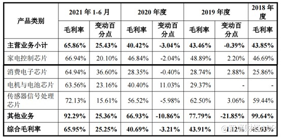 不过公司也在招股书中表示,上游晶圆制造及封测厂商因产能紧张等原因带来的涨价会拉低公司的毛利率水平,若将2021年1-6月晶圆成本价格替换为截至2021年6月末各型号晶圆价格上涨后的下单价格进行测算,公司2021年1-6月主营业务毛利率将下降至60.48%。