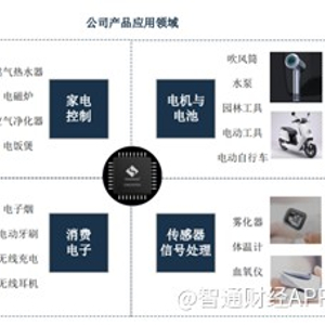 智通财经了解到,中微半导全名中微半导体(深圳)股份有限公司,是一家专注于数模混合信号芯片、模拟芯片的研发、设计与销售,致力于成为以MCU为核心的平台型芯片设计企业,产品主要包括家电控制芯片、消费电子芯片、电机与电池芯片和传感器信号处理芯片四大类;主要应用于小家电、消费电子、电机电池、医疗健康等领域,部分进入大家电、工业控制和汽车领域。
