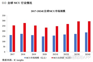 受物联网快速发展带来的联网节点数量增长、汽车电子的渗透率提升以及工业4.0对自动化设备的旺盛需求等因素的影响,MCU在汽车电子、人工智能、物联网、消费电子、通信等下游应用领域的使用大幅增加,导致近年全球MCU出货数量和市场规模均保持稳定增长。根据IC Insights预测,2021年全球MCU市场规模将达157亿美元,2024年将达188亿美元,3年CAGR预计达到6.19%。