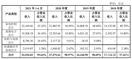 从产品类别来看,家电控制芯片以及消费电子是公司的主要收入来源,不过近年来,公司的家电控制芯片收入占比逐步下降,从2018年的80.70%降至2021年上半年的43.32%,而同期内消费电子芯片占比则从14.80%提升至36.10%。