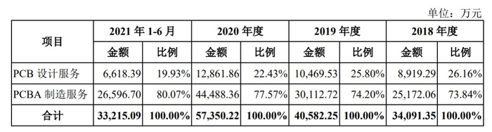 2018年度至2020年度,PCBA制造服务的收入从2.52亿元增长至4.45亿元,年平均复合增长率达到32.94%;2021上半年该项收入为2.66亿元,同比增长36.84%,同时占总收入的比例达到80.07%。