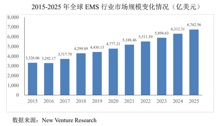 从New Venture Research 2020年度EMS行业报告中得知,2016至2020年,EMS行业市场规模发展较快,由3292.17亿美元增长至4777.21亿美元,平均年化增长率为9.75%,2025年的市场规模将达到6742.56亿美元。