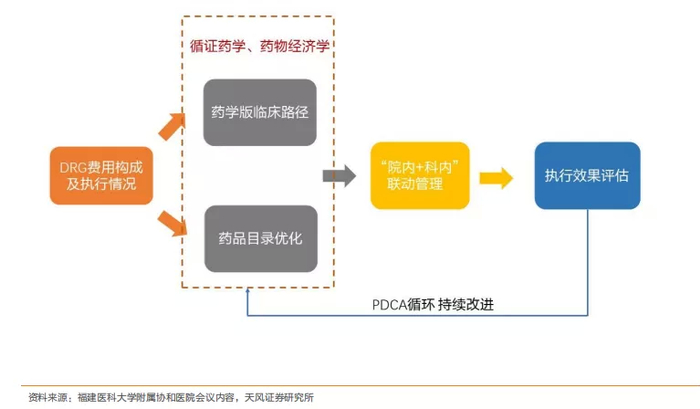 DRG是采用病例组合思想将患者分入若干诊断组进行管理的体系,在DRG 付费方式下,每个病例根据治疗手段和病人特征进入不同诊断相关组,医保部门将按照对应诊断相关组付费标准进行支付。DGR支付改革后对医院精细化能力要求有所提高,将倒逼医院加强精细化管理,加之药品零加成政策,药品将成为医院的成本项,推动合理用药,优化临床路径。
