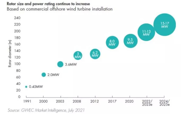 据中国能源报新闻,预计 “十四五”期间,我国海上风电累计新增规模将达到45GW,即年均实现9GW海上风电新增装机量。2021年11月16日,中欧海上风电产业合作与技术创新论坛在盐城召开,国家能源局新能源司副司长王大鹏出席论坛并致辞,提及风电场布局从近海向深水沿岸转变,目前海洋生态环境保护意识逐步增强,近海海上风电总体开发潜力有限,“十四五”中后期近海资源初步紧张。同时,借鉴欧洲海上风电经验趋势,中国海上风电建设海域由近及远发展是必然趋势。海上风电机组大型化同样也是近年来的发展趋势,在风电机组单位千瓦建设成本大致相同的情况下,大功率机组不仅发电量更高,随着机位数的减少,运输、吊装、以及线路等费用的节省同样可观。在“单位千瓦成本一定,追求发电量最高”的导向下,风机单机功率的增大成为不可逆转之势。