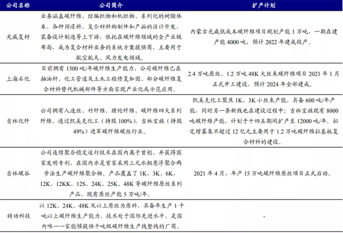 国内上海石化、吉林化纤等均有大丝束碳纤维扩产计划