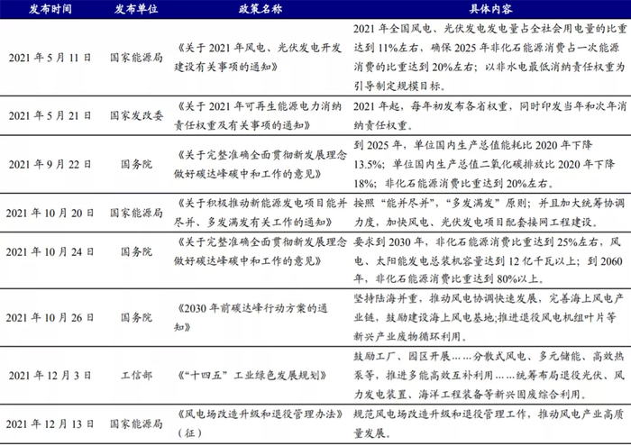 近两年国内“抢装潮”带动风电新增并网量大幅增长。近年来,国家积极出台电价和税收优惠配套政策推动风电产业发展,《关于2021年新能源上网电价政策有关事项的通知》明确2021年起陆上风电实行平价上网,大批项目加速推进。《关于促进非水可再生能源发电健康发展的若干意见》提出新增海上风电不再纳入补贴范围,按规定完成核准(备案)并于2021年12月31日前全部机组完成并网的存量海上风力发电,按相应价格政策纳入中央财政补贴范围。政策驱动风电行业新增装机量高增,2021年1-11月国内新增风电并网装机容量24.70GW;截至2021年11月,全国风电累计并网装机容量约3.05亿千瓦,同比增长29.1%。