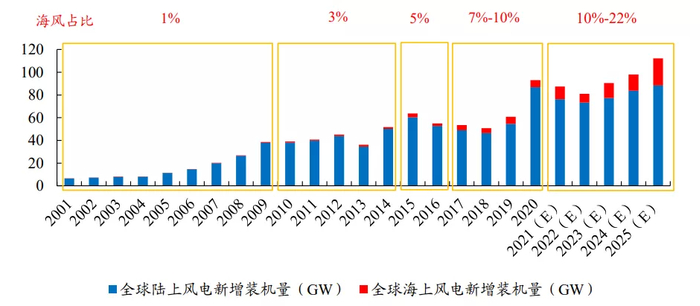 预计全球海上风电新增装机量占风电新增装机量比例呈上升趋势