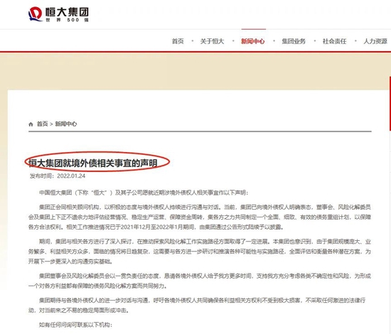 1月24日,恒大集团官网发布《恒大集团就境外债相关事宜的声明》。