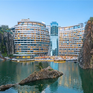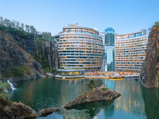 上海世茂佘山洲际酒店位于上海佘山天马山深坑内,建筑格局为地上3层、地下16层,其中地下16层包含水面以下2层,共计投资6亿元,前后建设长达8年。由于酒店建设在88米的深坑内,是世界上首个建设于坑内的五星级酒店。