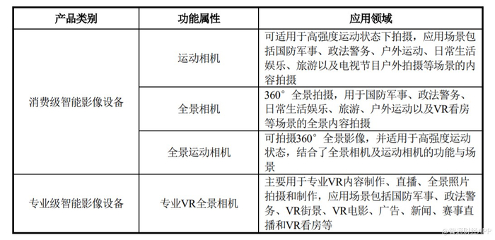 若按产品类别划分,专业VR全景相机属于专业级智能影像设备,主要用于专业VR内容制作、直播、全景照片拍摄和制作,应用场景包括VR电影、广告、新闻、赛事直播和VR全景看房、国防军事、政法警务、VR街景等。产品包括Pro系列和TITAN等,面对的主要是B端用户。