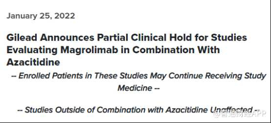 与此同时,吉利德也宣布将部分暂停CD47抗体+阿扎胞苷联合治疗的所有临床研究。部分暂停期间,Magrolimab+阿扎胞苷联合治疗的所有临床将停止筛选与入组,而已入组的患者则会继续接受治疗,并进行严密的数据监控。据悉,此次受影响的Magrolimab+阿扎胞苷联合治疗临床包括所有3项三期临床(AML、MDS、unfit AML)、1项1b期临床以及1项二期临床。