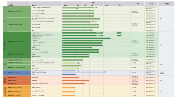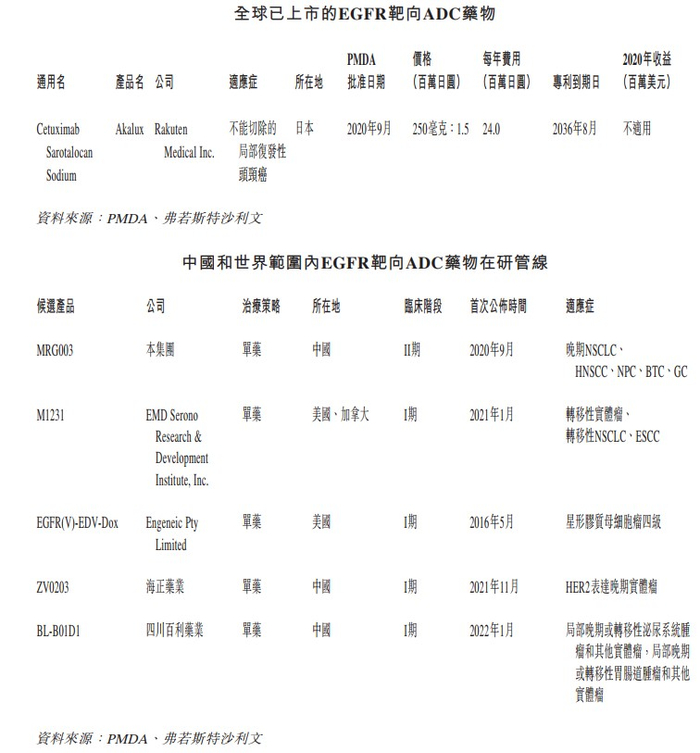 就拿MRG003来说,MRG003是一款EGFR靶向的ADC药物,目前中国尚无获批准的EGFR靶向ADC药物上市。全球范围内,除了日本Rakuten Medical的产品Akalux(适用于不能切除的局部复发性头颈癌)获PMDA批准外,还没有其他靶向EGFR的ADC获批,而乐普生物的MRG003已经在中国进行多项的II期临床试验其他同靶点ADC药物均处于临床I期。