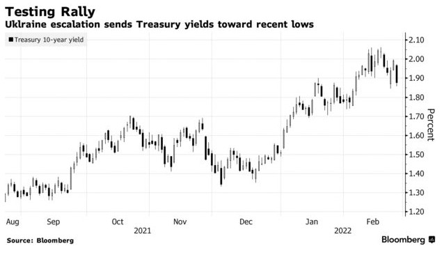 美国国债收益率在本月早些时候升至疫情后高点后回落,原因是市场猜测美联储将大幅加息以遏制通胀。乌克兰的僵局让投资者的问题变得更加复杂,因为它可能加剧通胀压力,同时导致股市大幅下跌。