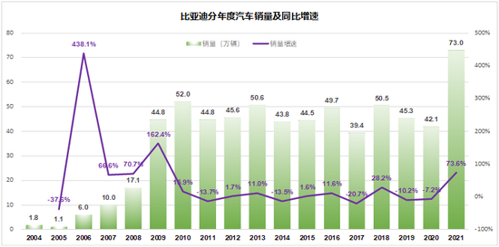 2010年之后,比亚迪就进入瓶颈期,号称“比3万”。每月3万多,每年四五十万的销量,这种半死不活的状态整整持续了10年,一直到2021年,比亚迪的年销量才第一次超过2010年。