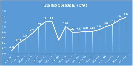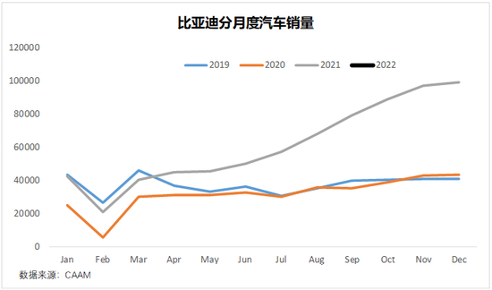 从月度销量看,比亚迪最近3个月的月度销量已经接近10万辆,假如我们简单的线性外推,比亚迪2022年的年度销量应该在120万辆左右。实际上,比亚迪公开给市场的业绩指引是150万辆,更激进当然是王传福内部给的200万辆的大跃进。考虑到过去10年,王传福在汽车上放过的卫星不计其数,能兑现的场景确实不多,2022年120-150万辆的销量区间,其实还是比较合理的。
