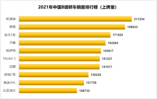 迄今为止,汉不仅仅是比亚迪最重要的一款车,也是中国自主品牌历史上具有里程碑意义的一款车。2021年,按照工信部的上牌数据,比亚迪汉以10.87万辆的上牌量,冲进了中国B级轿车销量排名榜的前十,排在这个榜单前面的,都是老牌的外资钉子户,凯美瑞、雅阁,宝马3……