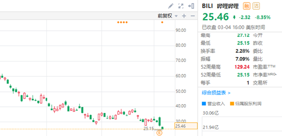 周五晚间,B站美股股价收跌-8%以上,再次刷新了自2020年5月以来的新低,自高位回撤达80%。截至发稿,B站报收25.46美元,跌幅-8.35%。