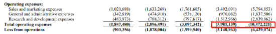可以看出,不管是销售和市场费用、还是公司一般费用以及研发费用,几乎都在成倍增长,而其中最大头的还是销售和市场费用,达到57.9亿元,占比达到55%。