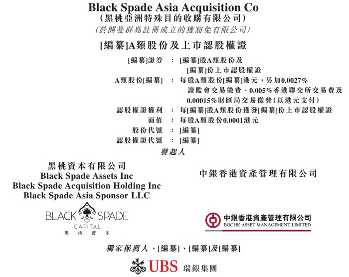 该公司的发起人是黑桃资本、Black Spade Assets、Black Spade Acquisition Holding及Black Spade Asia Sponsor(即“BSA发起人”)以及中银香港资产管理。