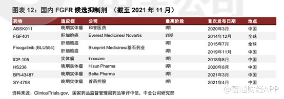 目前,全球共有三款获批准的泛 FGFR 抑制剂产品,包括强生的厄达替尼、Incyte 与信达生物联合研发的培米替尼和 QED Therapeutics 的英菲格拉替尼,中国目前还没有批准上市的FGFR抑制剂。