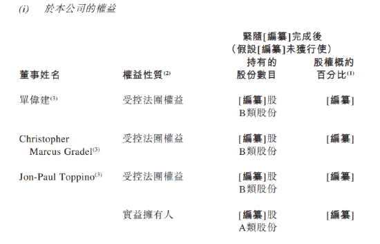 单伟建为公司创始人兼执行主席,目前为阿里巴巴独立非执行董事,Christopher Marcus Gradel为公司联合创始人兼首席执行官,Jon-Paul Toppino为公司联合创始人兼总裁,三人通过不同权持有公司权益,为公司控股股东,上市前持股50%。公司采用不同权股权架构,A类股份持有人每股可投一票,而B类股份持有人则每股可投10票。