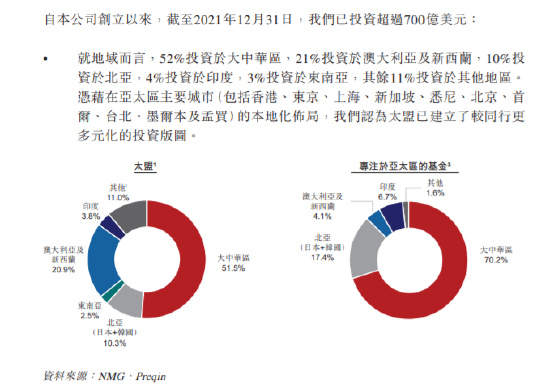 公司采取多元化的投资策略,截止2021年12月31日,公司已投资超过700亿美元,同时已回收400亿美元。就地区而言,公司52%投资于大中华地区。就策略部门而言,31%投资于私募债务,36%投资于私市股权,19%投资于不动产及13%投资于流动性策略及公开市场。
