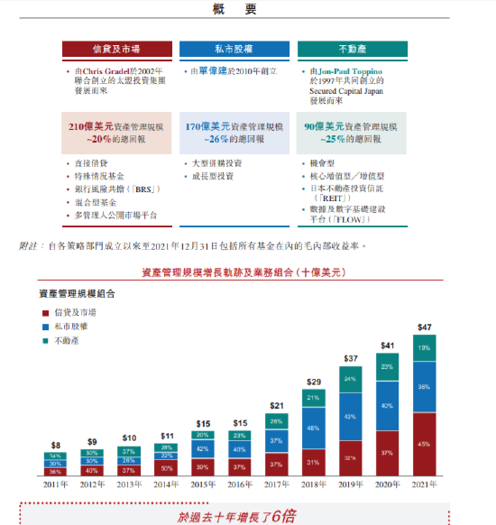 截止目前,公司管理资产规模约500亿美元,在亚太区大约有600名员工,公司三大策略部门中,信贷及市场资产管理规模高达210亿美元,总回报大约20%;私市股权部门管理资产170亿美元,总回报大约26%;不动产规模90亿美元,总回报25%。