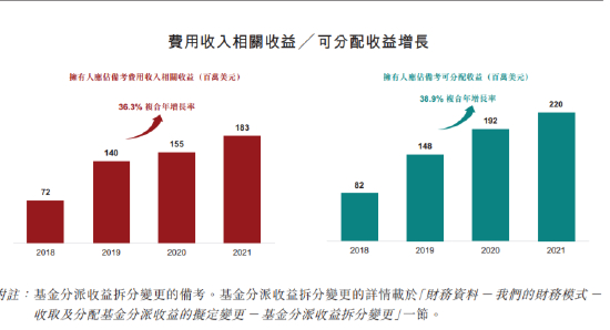 根据财报,从截至2018年12月31日止年度至截至2021年12月31日止年度,经计及基金分派收益拆分变更,公司拥有人应占费用收入相关收益以36.3%的复合年增长率由72.2 百万美元增至182.6百万美元,且本公司拥有人应占可分配收益以38.9%的复合年增长率由82.2百万美元增至220.4百万美元。截至2021年12月31日止年度,费用收入相关收益率为47.7%,费用收入相关收益占公司的可分配收益的82.8%。