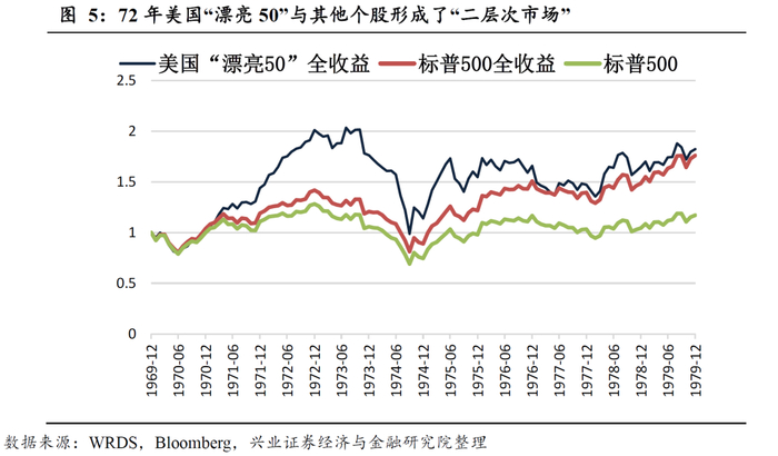 71-72年年间,美国“漂亮50”涨幅远远超过标普500指数,2年时间内,美国“漂亮50”组合50只股票的算数平均涨幅是102%,同期标普500全收益指数仅为36%,涨幅接近指数的3倍。尤其是1972年,在市场出现整体震荡甚至下滑的时候,“漂亮50”仍在上涨,出现了所谓的“二层次市场”(福布斯杂志),即市场分为上层的50只股票(“漂亮50”)和下层的“橡皮”(非漂亮50处于下跌趋势)。当时投资者对“漂亮50”出现投资幻觉,公司业绩如此之好,付出任何代价都无所谓,股价的一路飙升总会让你获得巨大的收益。截止到72年年底,美国“漂亮50”平均PE达到了41.5倍,而同期标普500的PE为19倍,美国“漂亮50”平均PE是标普500的2.2倍。