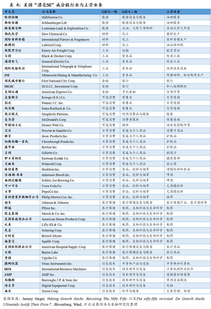 当时美国各机构对“漂亮50”名单不一,我们选取一份具有代表性、相对权威的漂亮50名单,摘录自JeremySiegel的《ValuingGrowth Stocks: Revisiting The Nifty Fifty》和《The nifty-fifty revisited: Do Growth Stocks Ultimately Justify Their Price?》两篇文献。从行业分布看,“漂亮50”的公司主要分布在消费、医药和信息技术等第三行业,日常消费、可选消费、医疗和信息技术个数分别为13、11、6、6家,四个行业个数占比超过70%。
